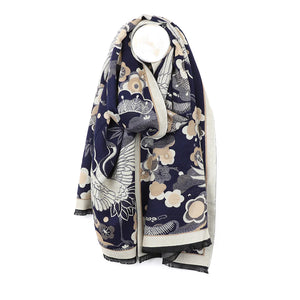 Wrap yourself in elegance with this beautifully crafted scarf, featuring a delicate floral pattern in ecru and soft taupe with graceful cranes.