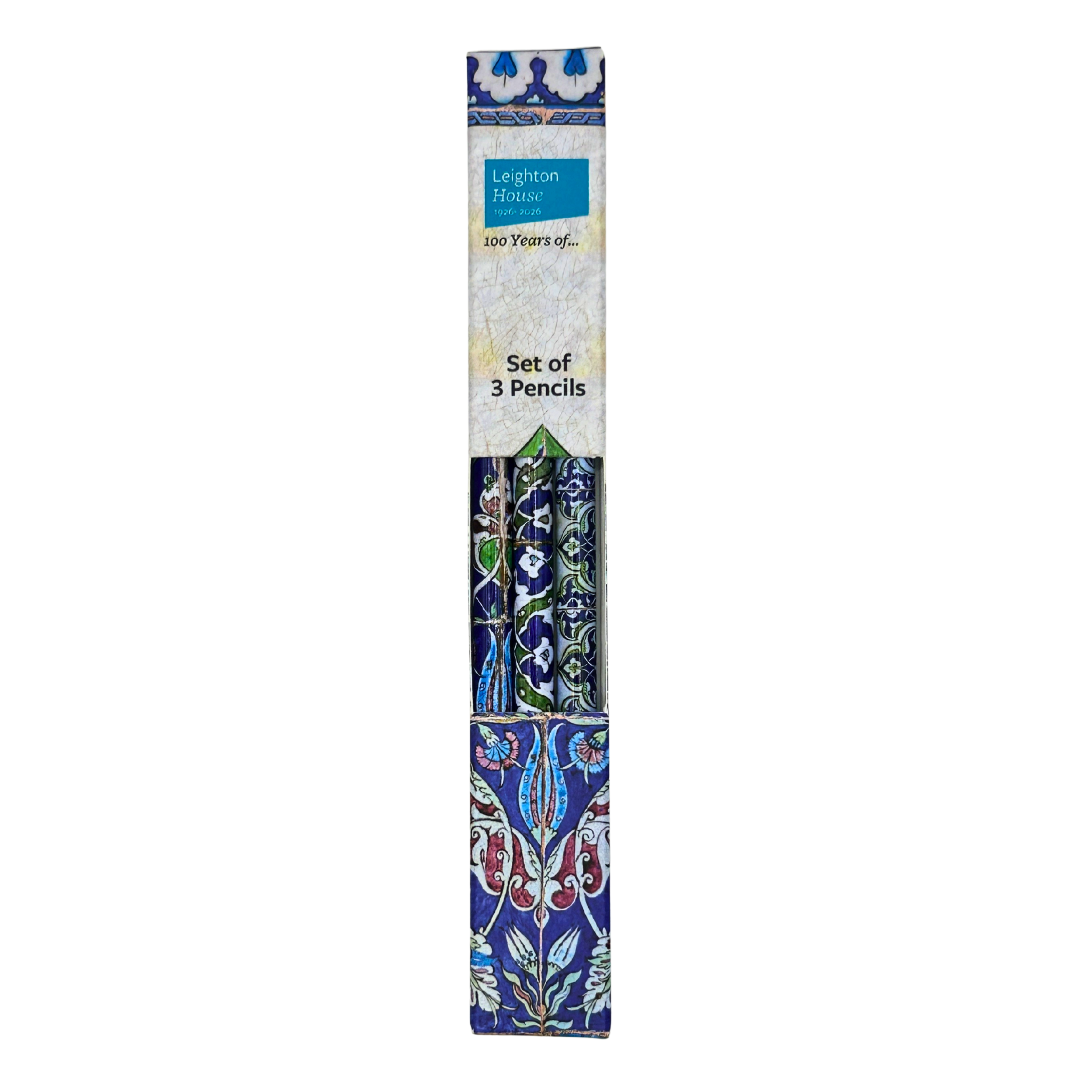 Set of 3 pencils from our exclusive Arab Hall range. Featuring 3 different tile patterns from the decorative William De Morgan tile panel from the south wall of the Arab Hall, Leighton House. The pencils come in their own full colour printed box.