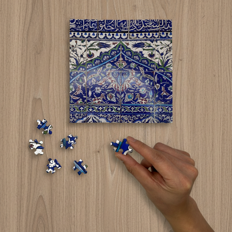 750 piece puzzle in it's own cotton drawstring bag. This puzzle is part of our exclusive Arab Hall range featuring the decorativeWilliam De Morgan tile panel from the south wall of the Arab Hall, Leighton House.