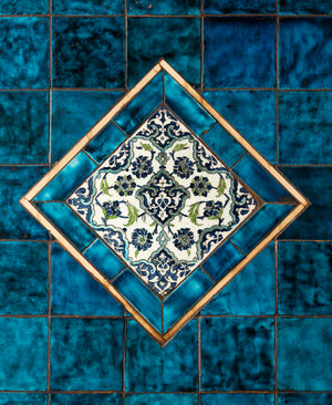 Exclusive Arab Hall collection water bottle made in double walled, insulated stainless steel. The bottle features a blue textured and engraved detail from a decorativeWilliam De Morgan tile found on the south wall of the Staircase Hall, Leighton House.