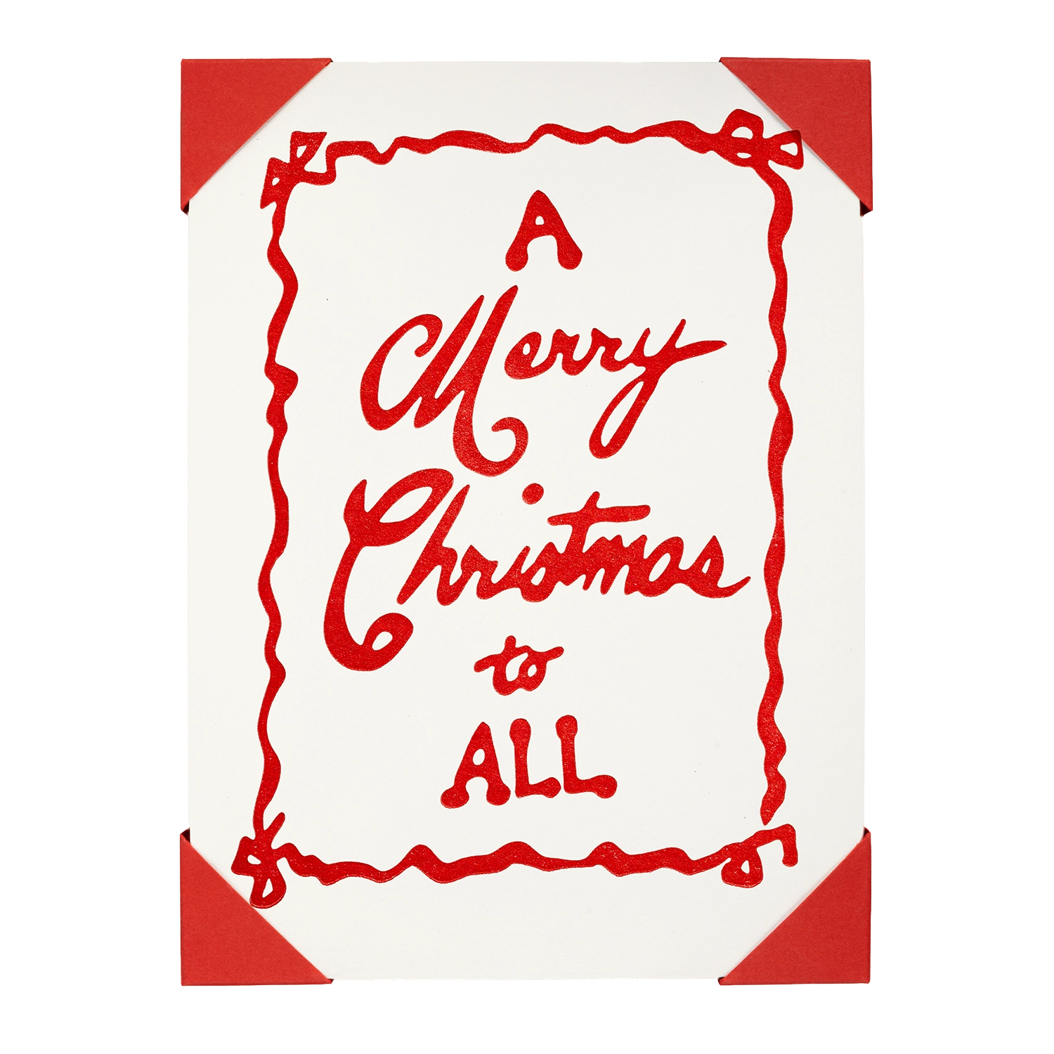 This small letterpress card featuring the words 'A Merry Christmas to All' in red handwritten font with a red bow border.